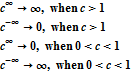 We can see that when c>1, c∞ must tend toward ∞, because multiplying some positive value greater than one by itself a greater and greater number of times will give us larger and larger values (and we can obtain a value as large as we want just by making the exponent as large as we need to do this). We can see that when 0<c<1, c∞ must tend toward 0, because multiplying some positive value less than one by itself a greater and greater number of times will give us values with smaller and smaller magnitudes (or values that are closer and closer to zero).