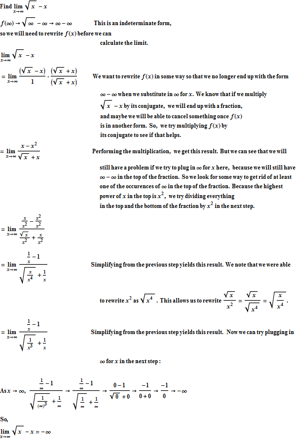 In the third row of our table we notice that ∞ - ∞ (or -∞+∞) is indeterminate, while ∞+∞ (or -∞ - ∞) is determinant - why is this the case? Let's think about this and then work out some limit examples. We can see that ∞+∞ must tend toward ∞ because adding two values together, both of which are increasing without bound, will just give us a third value that is also increasing without bound. (Similarly -∞ - ∞ will give us something that is decreasing without bound.)