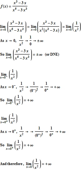 For this equation, directly substituting c into f(x) will again give us 0/0, which is undefined. However, while a/0 is undefined for all values of a, a fraction where the top remains fixed at a non-zero value and where the bottom approaches (but does not reach) zero actually approaches positive or negative infinity (depending on the signs of the numerator and denominator). To determine where f(x) may increase versus decrease without bound (i.e. whether the infinity should have a positive or negative sign in front of it), we must look at each one-sided limit separately:
